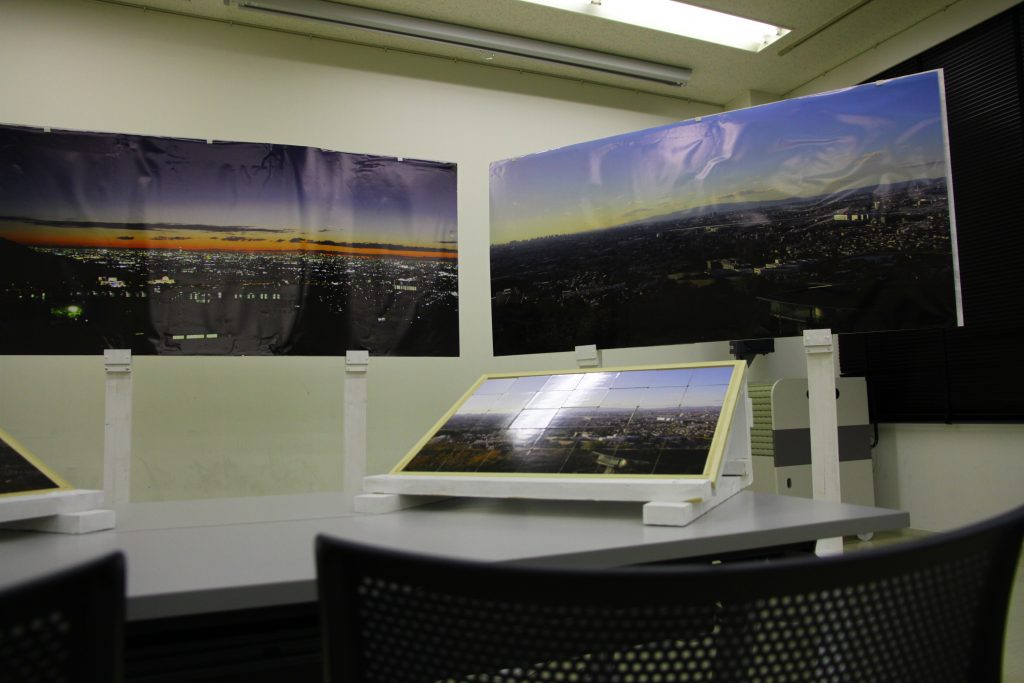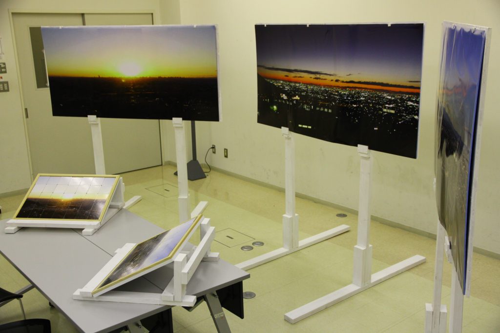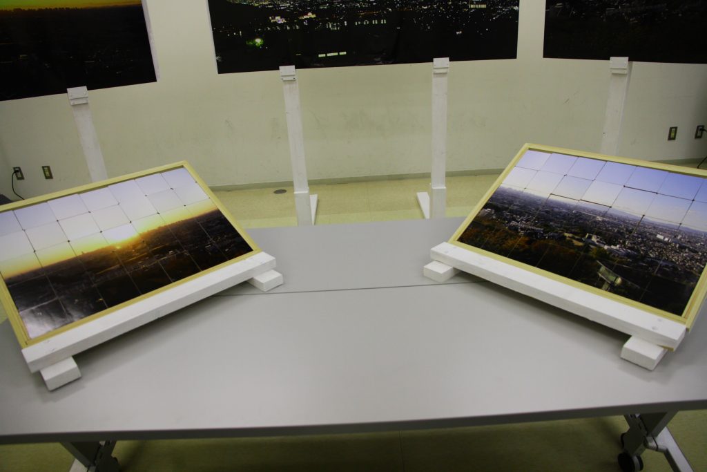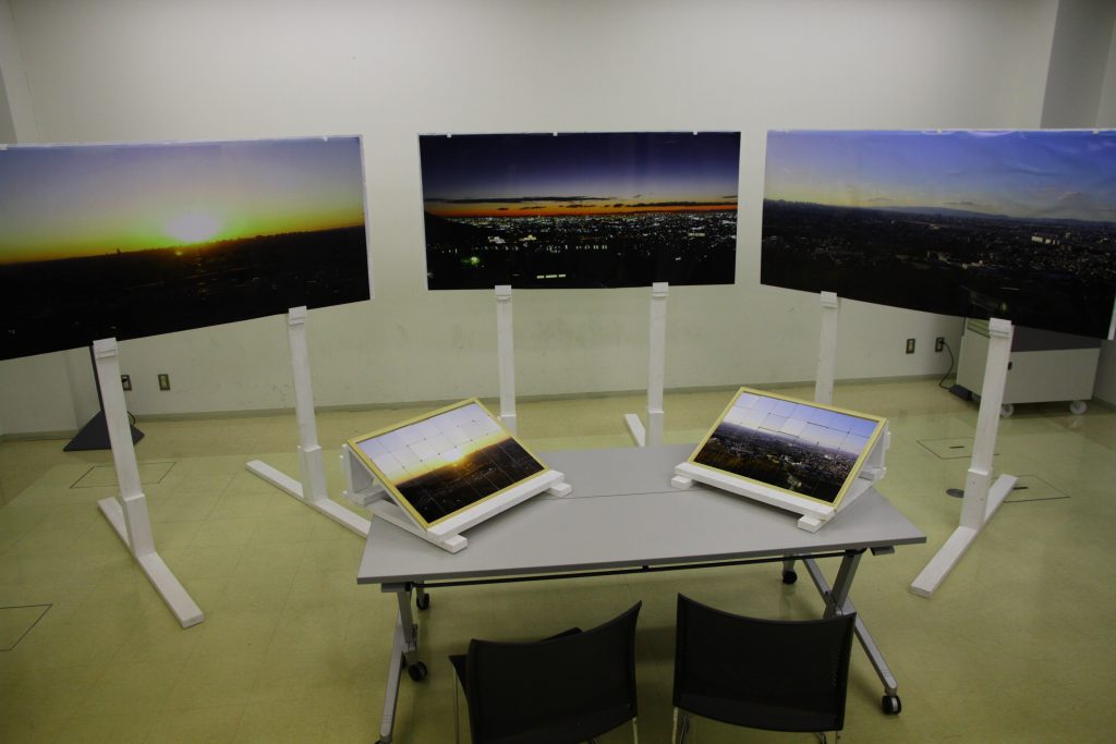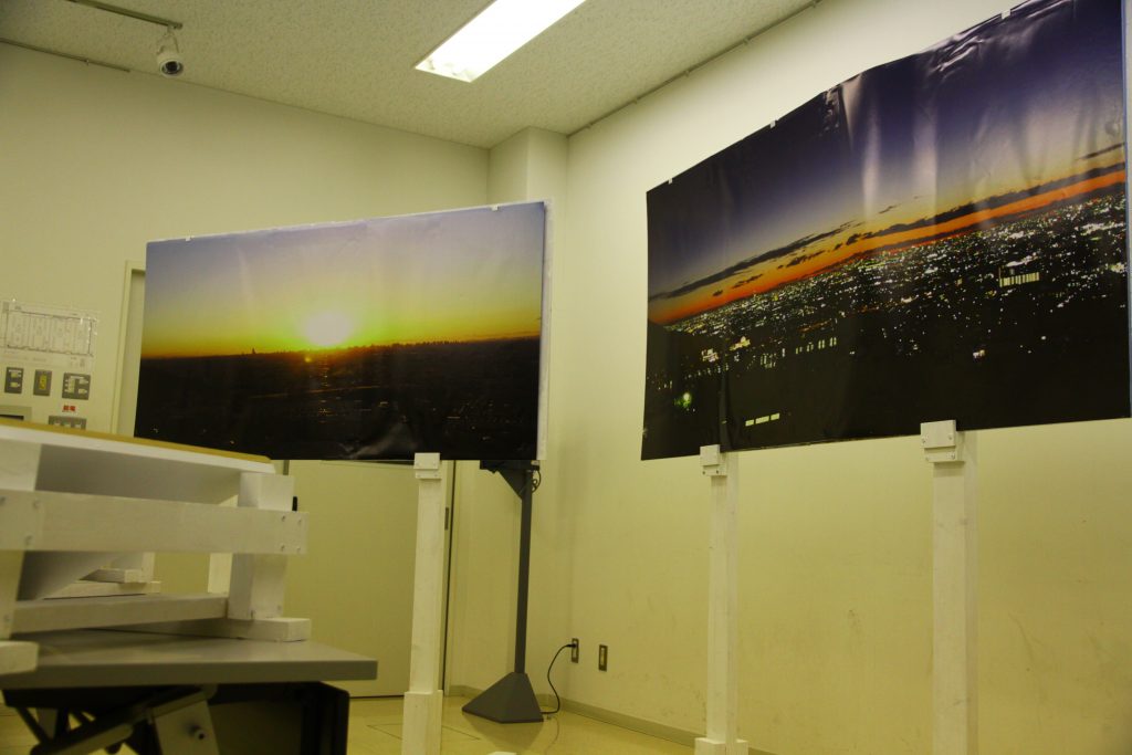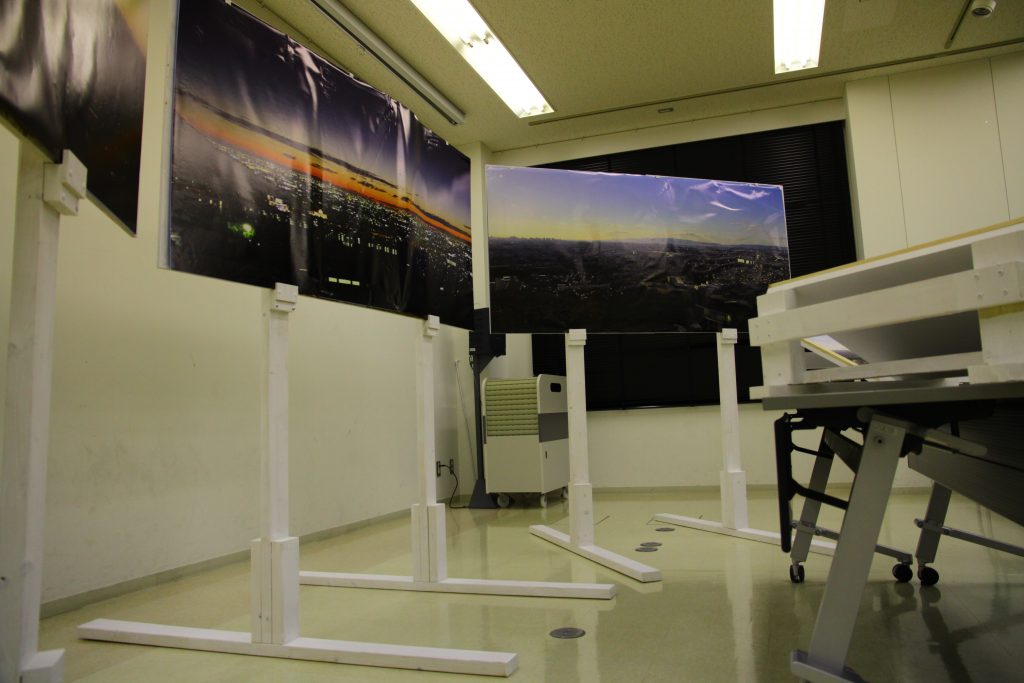 写真の展示ついて、昼夕方晩の計3枚の写真を大判印刷(180cm×90cm)その後、木材で制作した台にて展示しています。