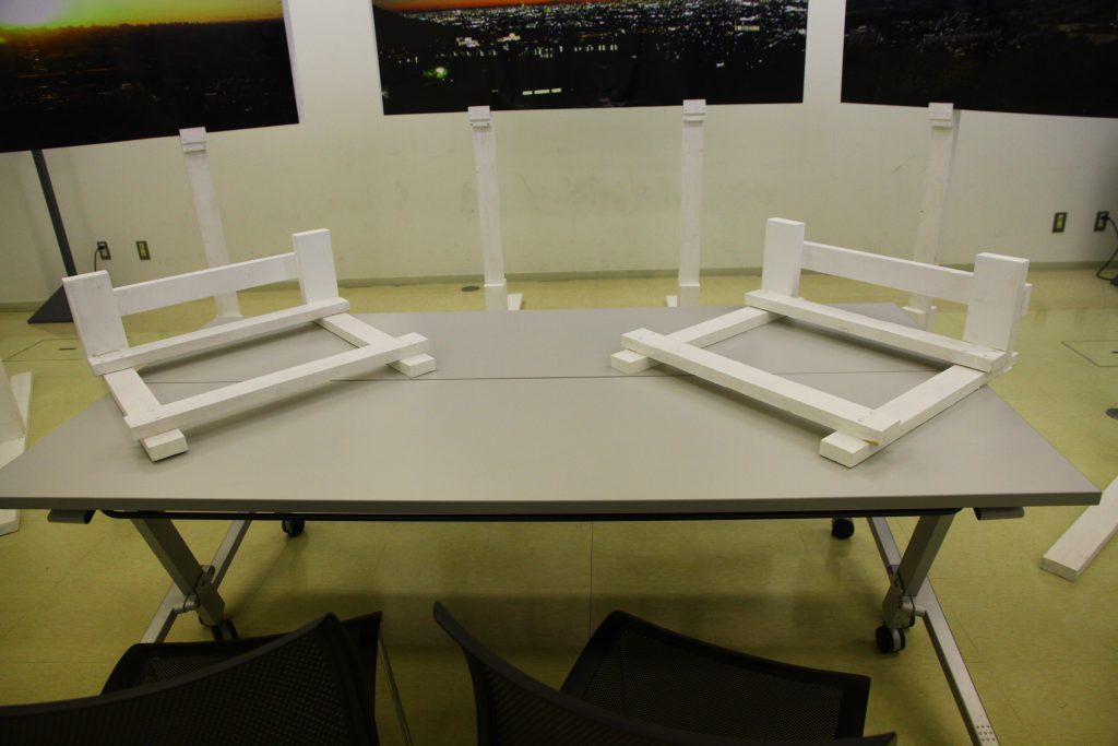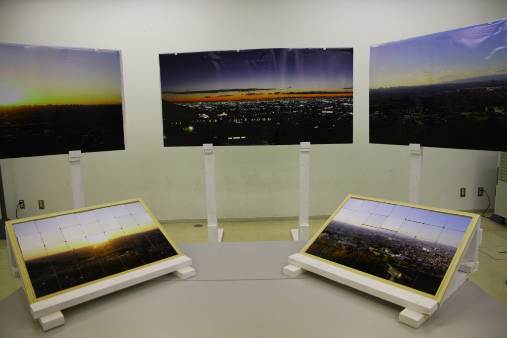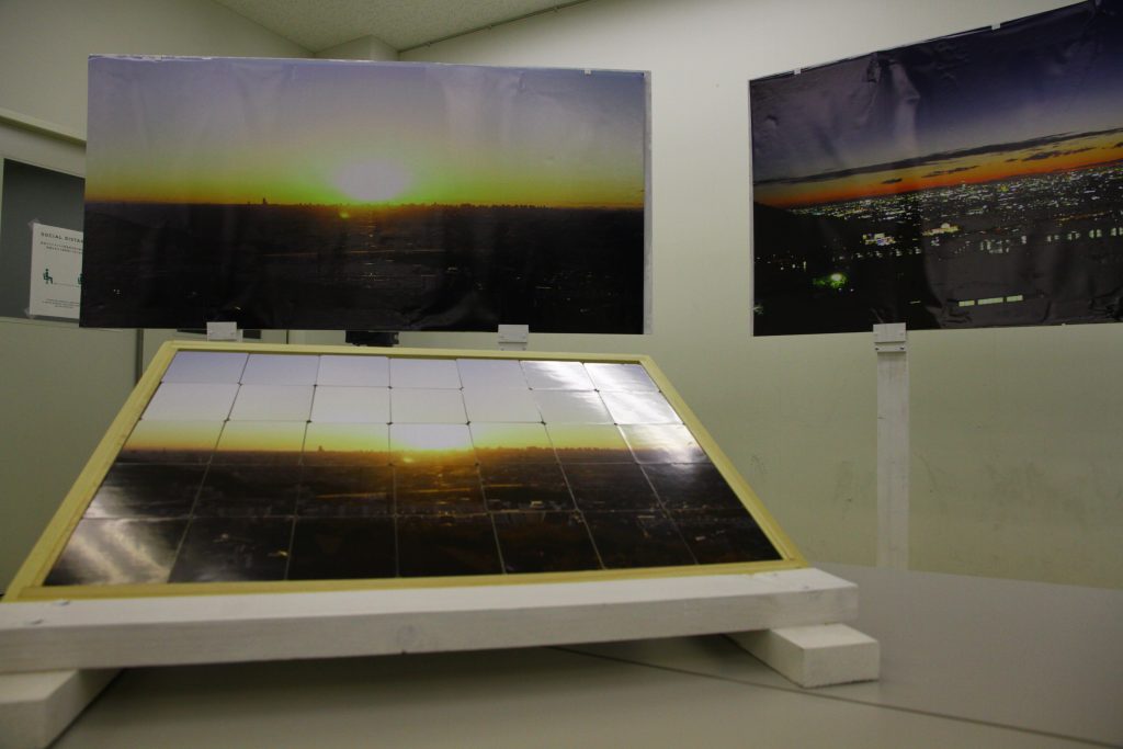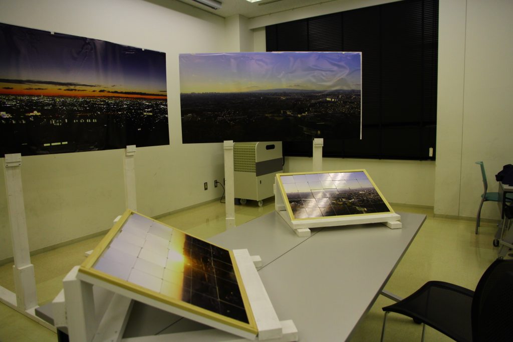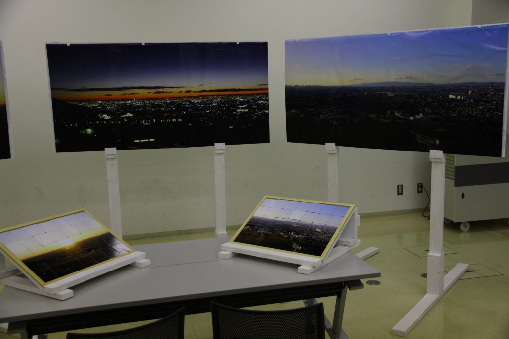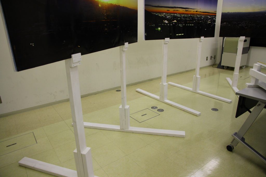 写真の展示ついて、昼夕方晩の計3枚の写真を大判印刷(180cm×90cm)その後、木材で制作した台にて展示しています。