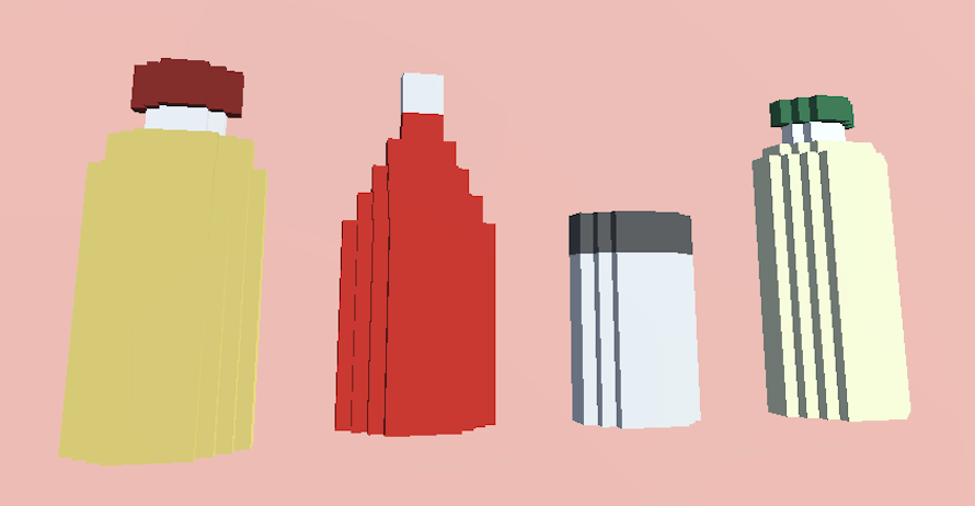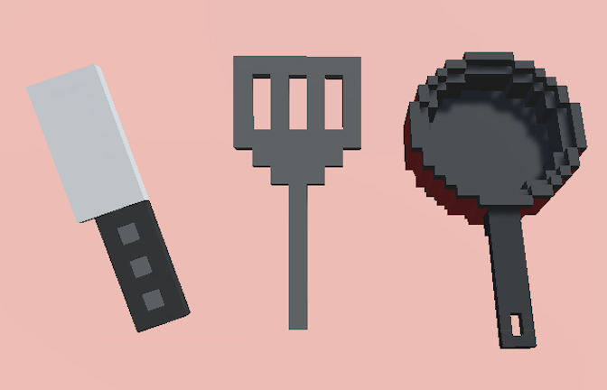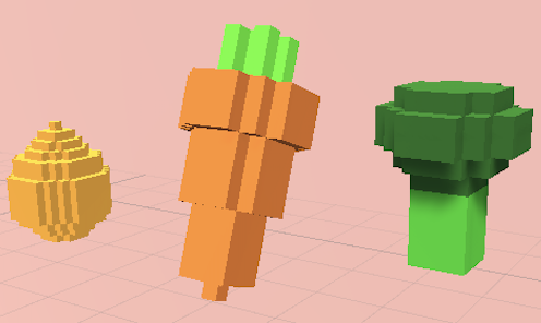開発はUnityで、ゲーム中に存在するオブジェクトはMagicaVoxel※で作成しました(手のモデルは既存のものを使用)。子供が料理を体験しながらもゲームとして成立させるためには、楽しむこと且つ料理の手順や方法を学ぶことが必要です。なので、料理の材料などのオブジェクトを全ておままごとで使う玩具のような形状にしました。