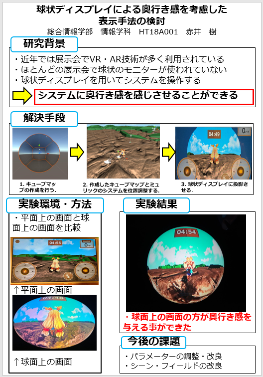 近年では博物館などの展示会で VR・AR技術が多く利用されるようになっている中、ほとんどの展示会で球状のモニターがあまり使われていない。そこで、 球状ディスプレイを用いて操作することでいかに楽器を利用者側から奥行き感を感じさせることができるシステムについて検討しました。具体的には、球状ディスプレイを用いて、システム(ミュリック) をユーザが用いた際にシステムの奥行き感をみせるための3D 空間作成し、手法の検討を行った。開発環境に Unity 、Visual Studioを使用している。球状ディスプレイを用いて Unity 内でキューブマップの作成を行い、ミュリックを動かした際に、半球上の画面・平面上の画面との比較を行いました。